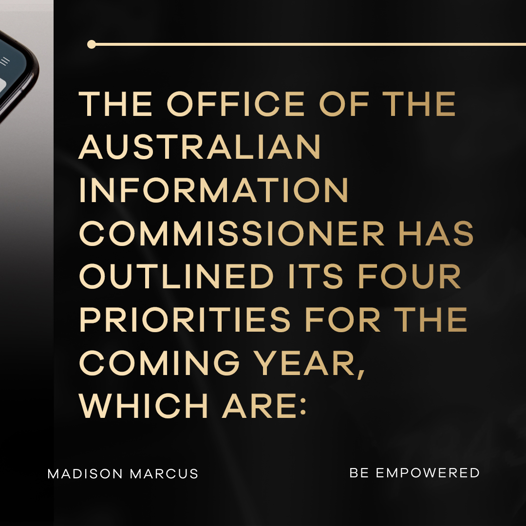 Hand holding smartphone showing OAIC 2025-26 regulatory priorities webpage with Madison Marcus gold M branding tile and Be Empowered tagline.